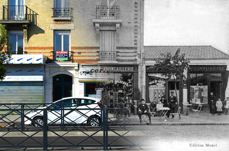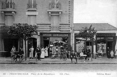 Bonus: La place de la République de Franconville est située dan le quartier de la gare. Sur la carte postale on y retrouve le commerce situé au bout de la place. A droite la teinturerie et une petite buvette qui faisait office de "salle de société" et proposait des liqueurs. A côté une épicerie-quincaillerie- vente de sabots et galoches, puis après le porche, le boucher. (Extrait de l'excellent livre de Jean-Pierre Debard (Franconville –"Mémoire en images" éditions Sutton)
